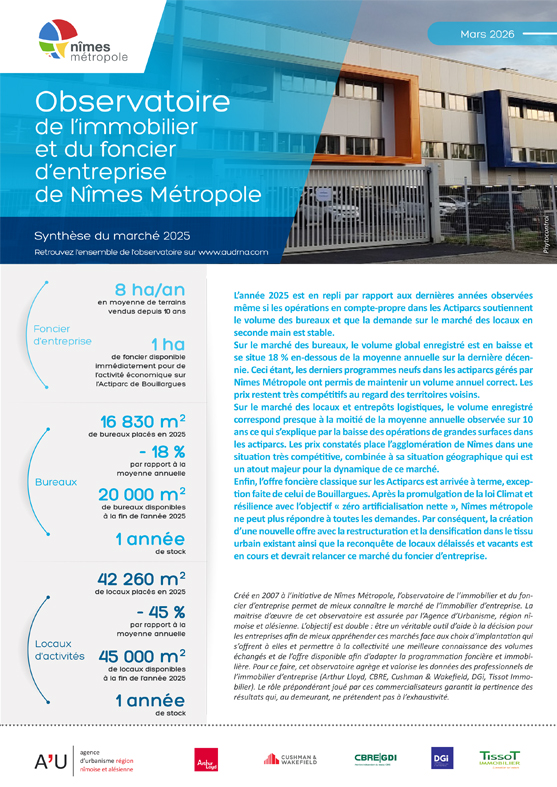 Comme chaque année, l’agence d’urbanisme a présenté en début d’année les résultats de l’observatoire de l’immobilier et du foncier d’entreprise à la demande de Nîmes Métropole, et avec le concours des principaux acteurs privés de ces marchés (Arthur Loyd, Cushman and Wakefield, CBRE, DGi et Tissot Immobilier).