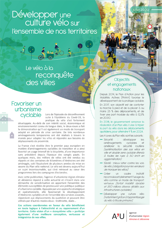 Avec cette publication, l’A’U répond ainsi à l’actualité et s’inscrit dans une démarche de sensibilisation en apportant une synthèse des éléments permettant de promouvoir une politique publique d’urbanisme cyclable. Ce document s’articule autour de quatre leviers d’actions que permet la pratique du vélo pour façonner nos villes :