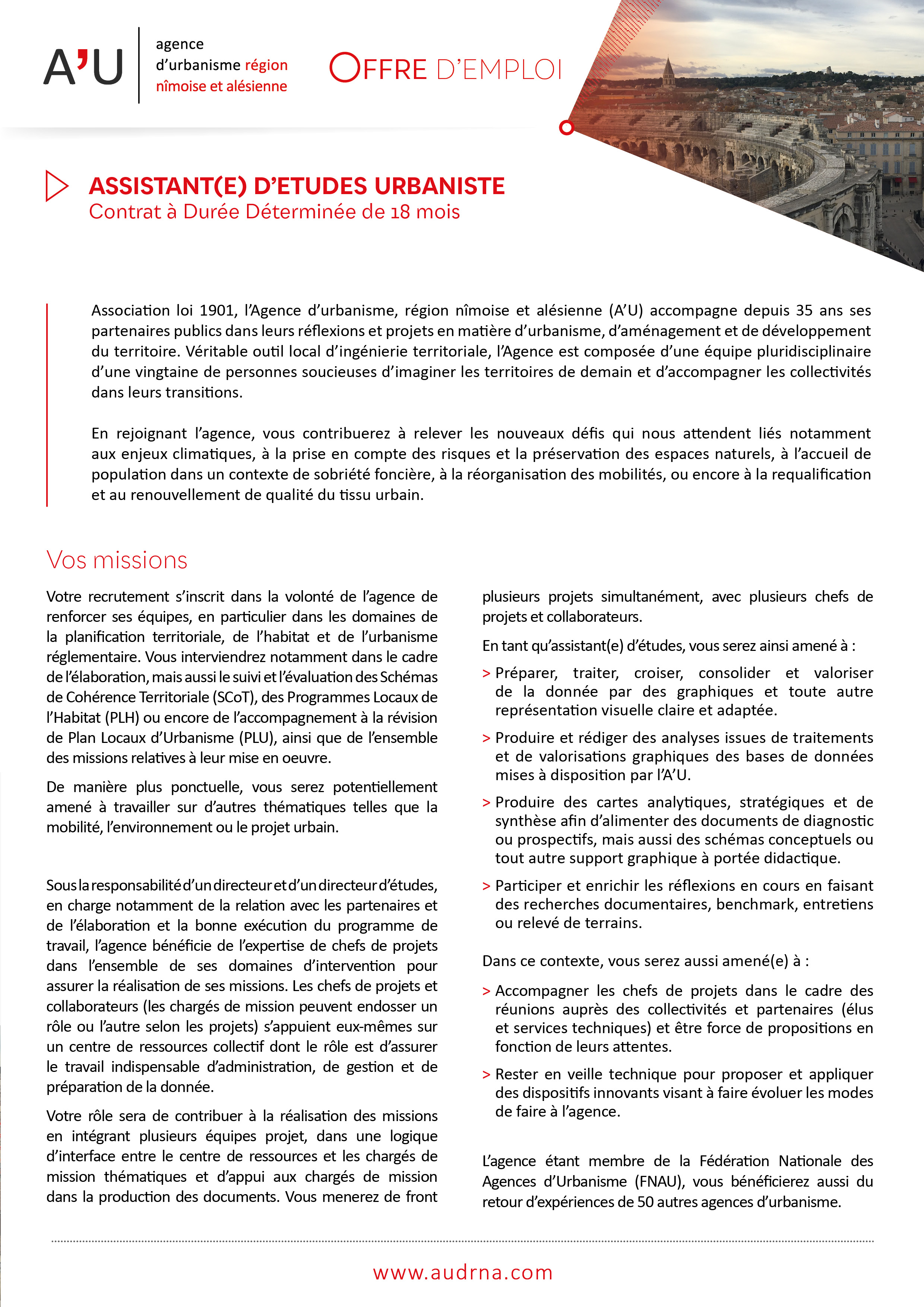 L'A'U recrute un(e) assistant(e) d'études urbaniste - CDD 18 mois Publication : 5 mai 2025 Retour Télécharger l'offre d'emploi "Assistant(e) d'études urbaniste"