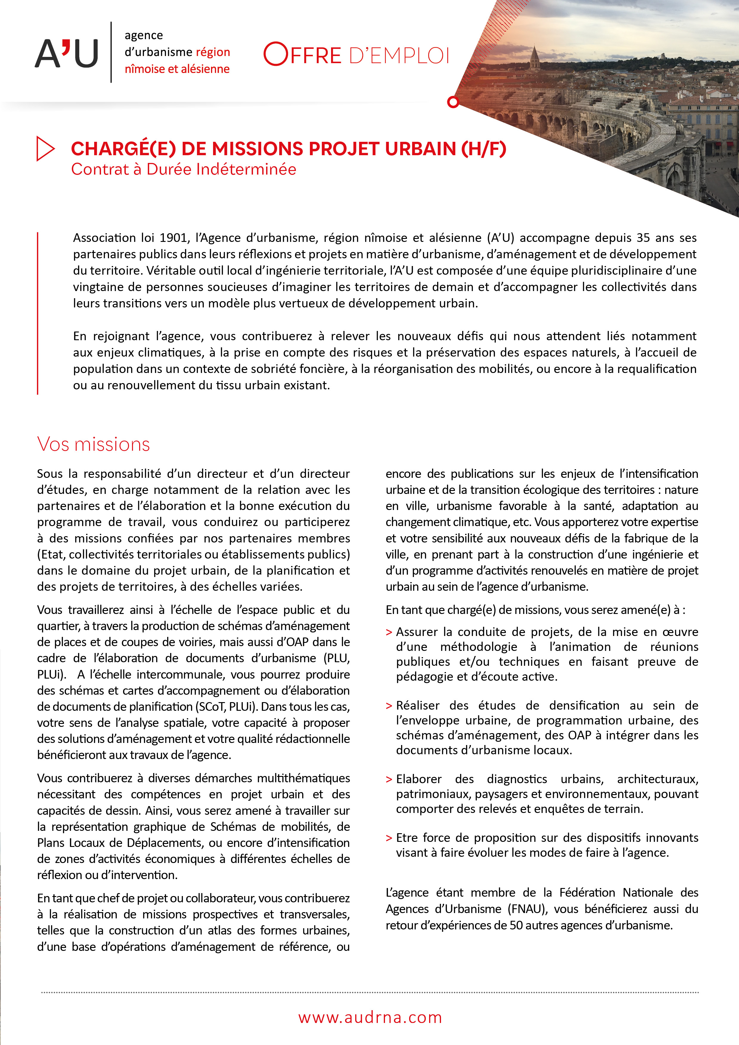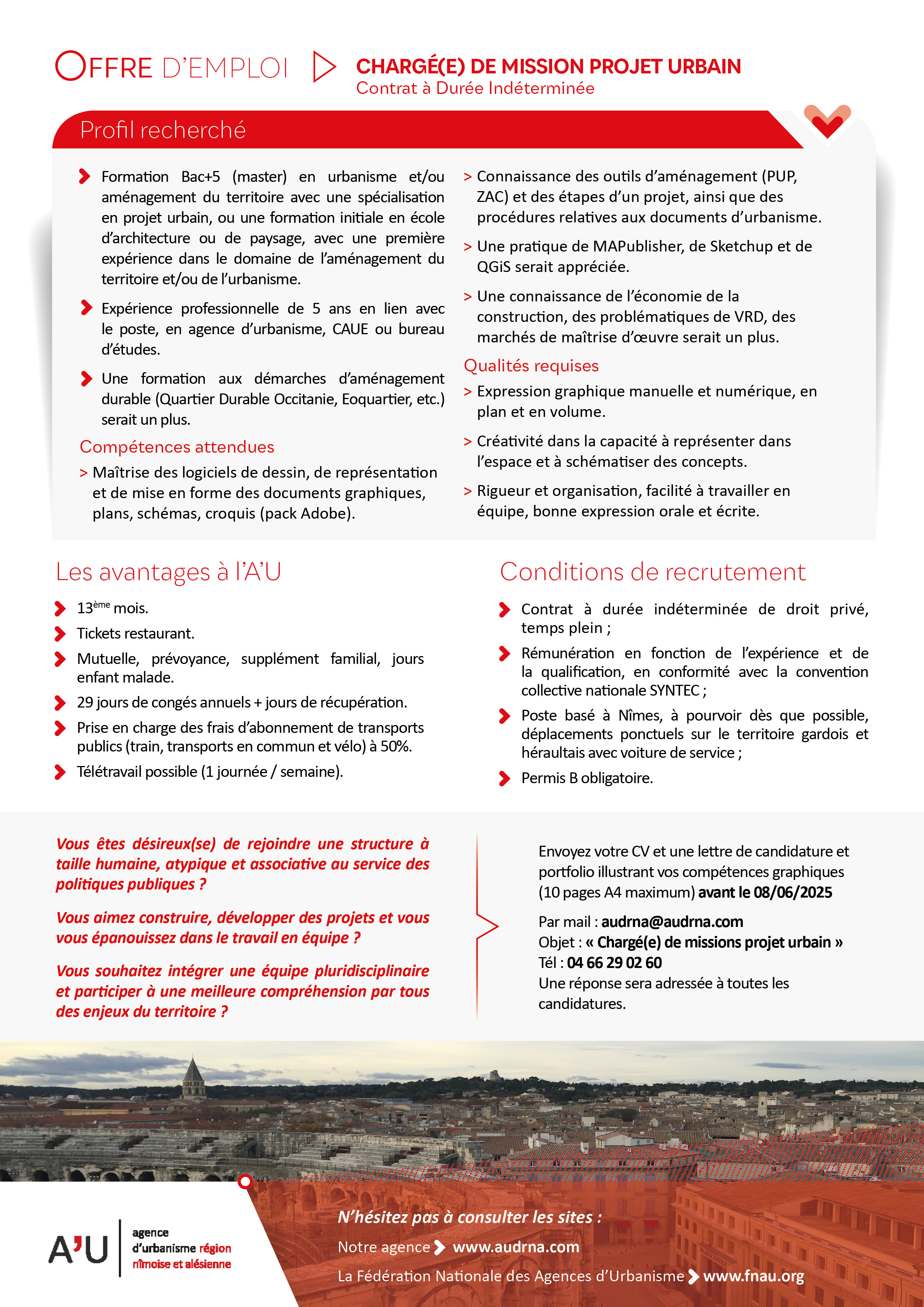 L'A'U recrute un(e) chargé(e) de missions Projet Urbain - CDI Publication : 6 mai 2025 Retour Télécharger l'offre d'emploi "Chargé(e) de missions Projet urbain"